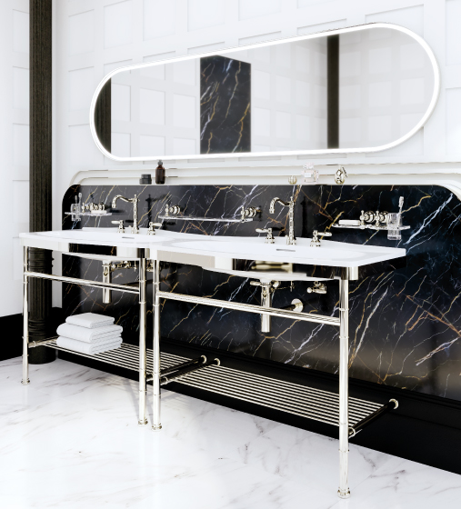 The wide range of accessories pick up stylishly and finish with a bell-shaped rosette. Exclusive, hand-worked surfaces donate a perfect harmony to the nostalgic style of the bathroom.