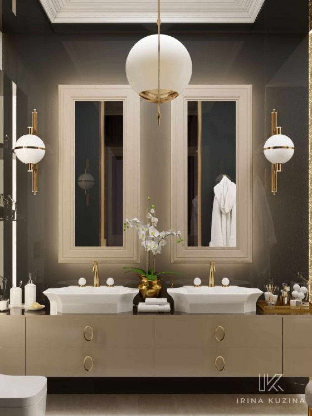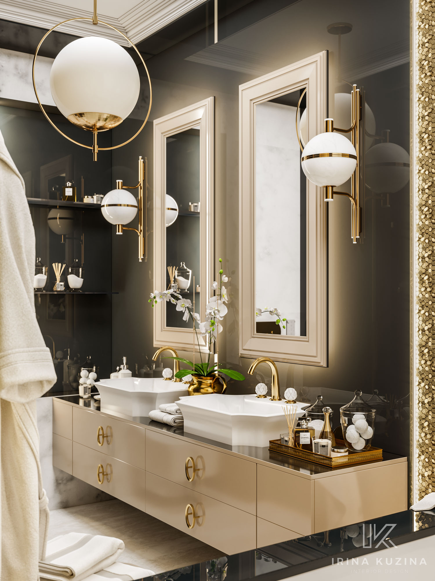 Dominating the entire space is a palette of colours consisting of discreet caramel and shades of gold, which is echoed in the furniture, walls and floors. But it is the details in pure white, such as the classic design of the countertop washbasins, the handles of the taps in the form of lotus blossoms, or the spherical lamps that produce such a special atmosphere of upscale elegance and purity.