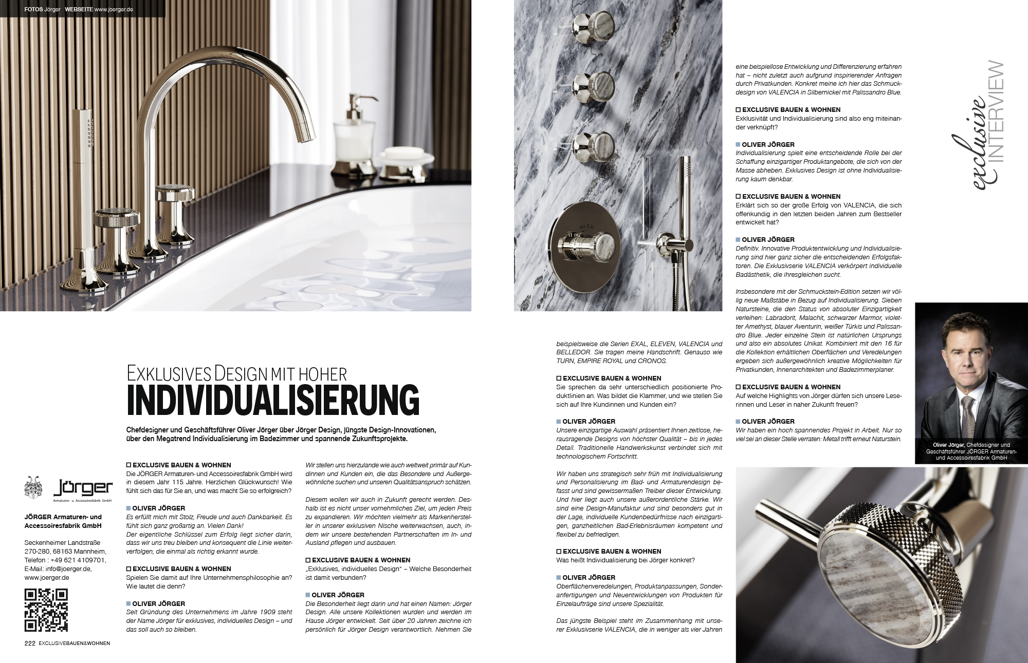 Оливер Йоргер – главный дизайнер и управляющий партнер JÖRGER Armaturen-und Accessoiresfabrik GmbH. Семейное немецкое предприятие из Маннгейма в 2024 году отмечает 115-летие. Интервью под заголовком «Эксклюзивный дизайн с высоким уровнем персонализации» опубликован в весеннем выпуске профильного австрийского журнала «exclusive Bauen und Wohnen».