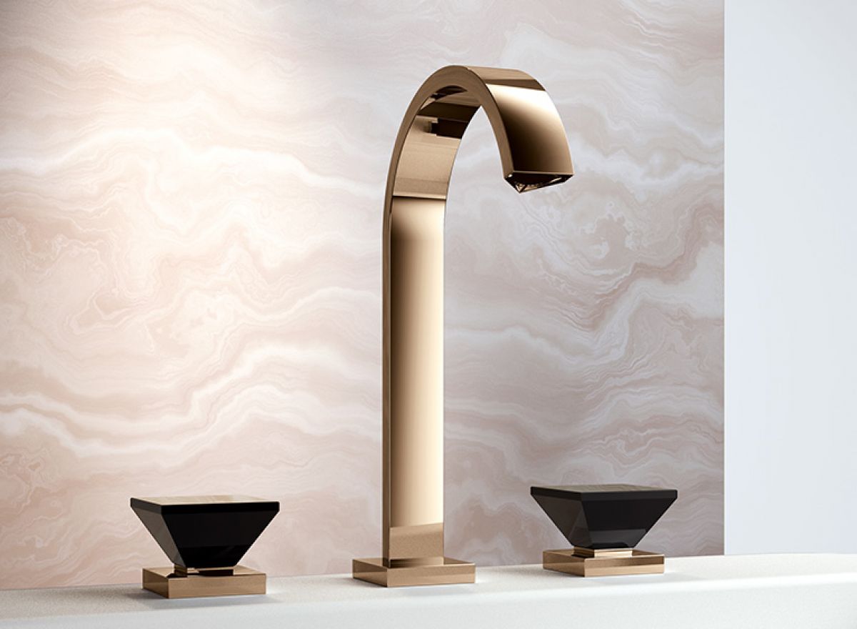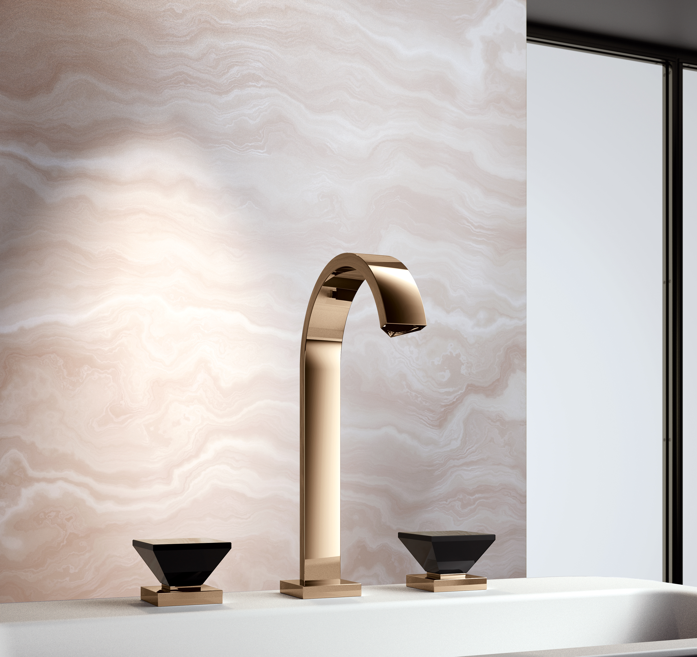 Излив смесителей изготовлен таким образом, что внешне, казалось бы, абсолютно плоская форма снабжена круглым аэратором, позволяющим воде мягко течь на руки и раковину, и в тоже время не утяжелять элегантность и утончённость дизайна. Вентили, выполнены из хрустального стекла в форме усечённой пирамиды, огранены по всему периметру. Хрусталь доступен в таких цветах как: прозрачный, чёрный и белый. Таким образом, будь то смесители для раковины, биде, ванны, или же запорные и переключающие вентили, все они декорированы хрусталём.