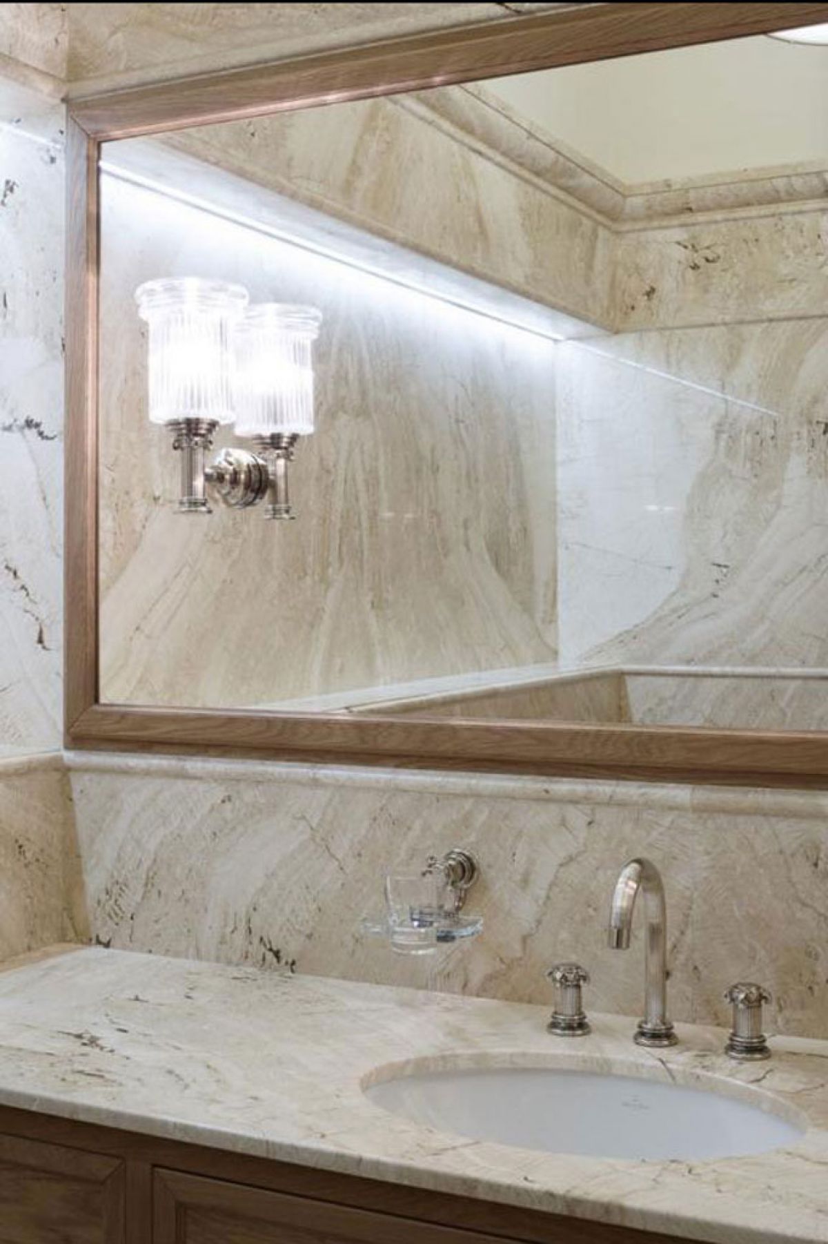 Смесители Aphroditе в форме античных ионических колонн изысканными акцентами вписались в интерьер ванной комнаты в загородном доме по проекту Ольги Зубовой