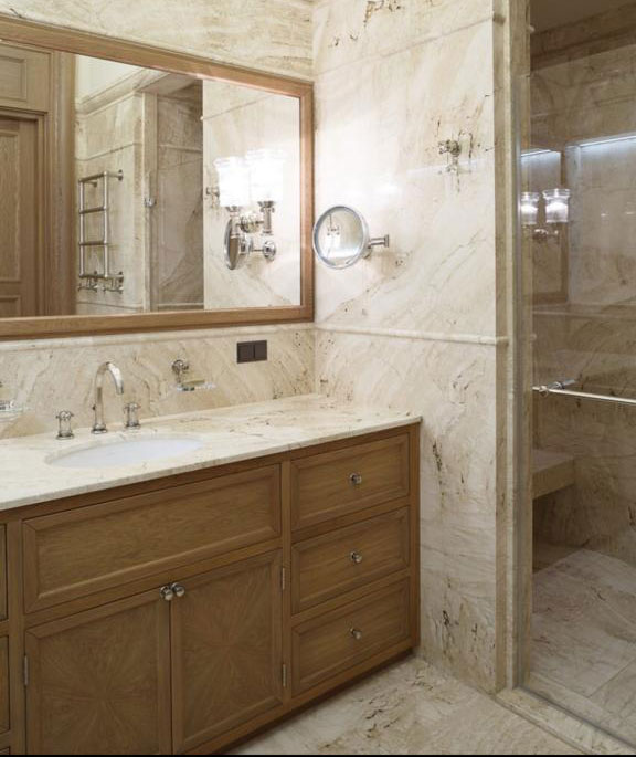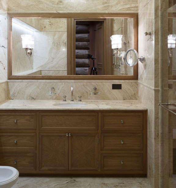 Спокойная палитра отделок в песочно-коньячных тонах, глубокие «чайные» оттенки дерева, традиционный стиль фасадов и мягкое освещение создают в ванной комнате атмосферу спокойной безмятежности, размеренности и покоя. А смесители и аксессуары Aphrodite, контрастируя своими изящными формами с рамочными фасадами из массивного дерева, придают помещению необходимую для выбранного стиля долю элегантности и здоровой буржуазности.