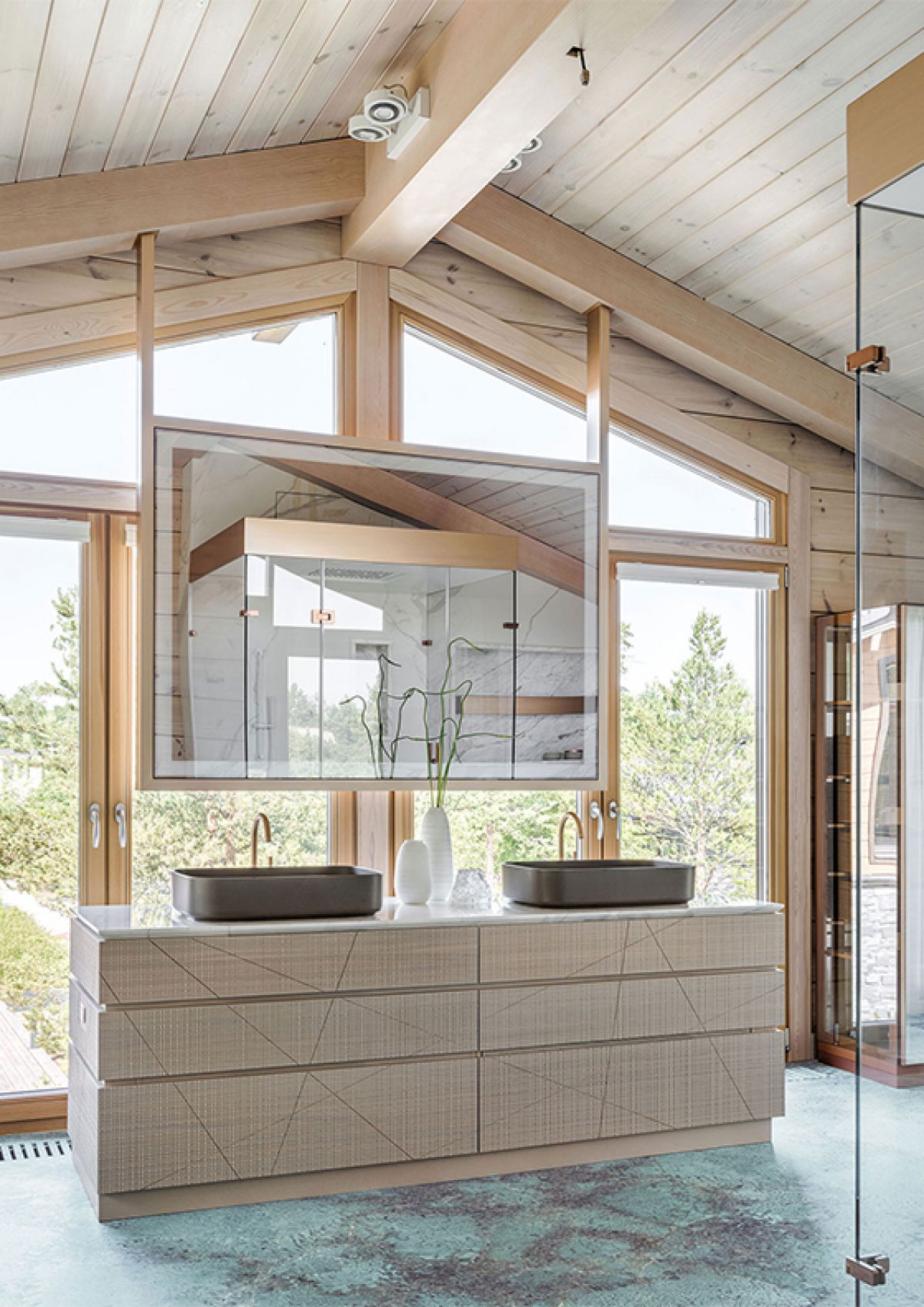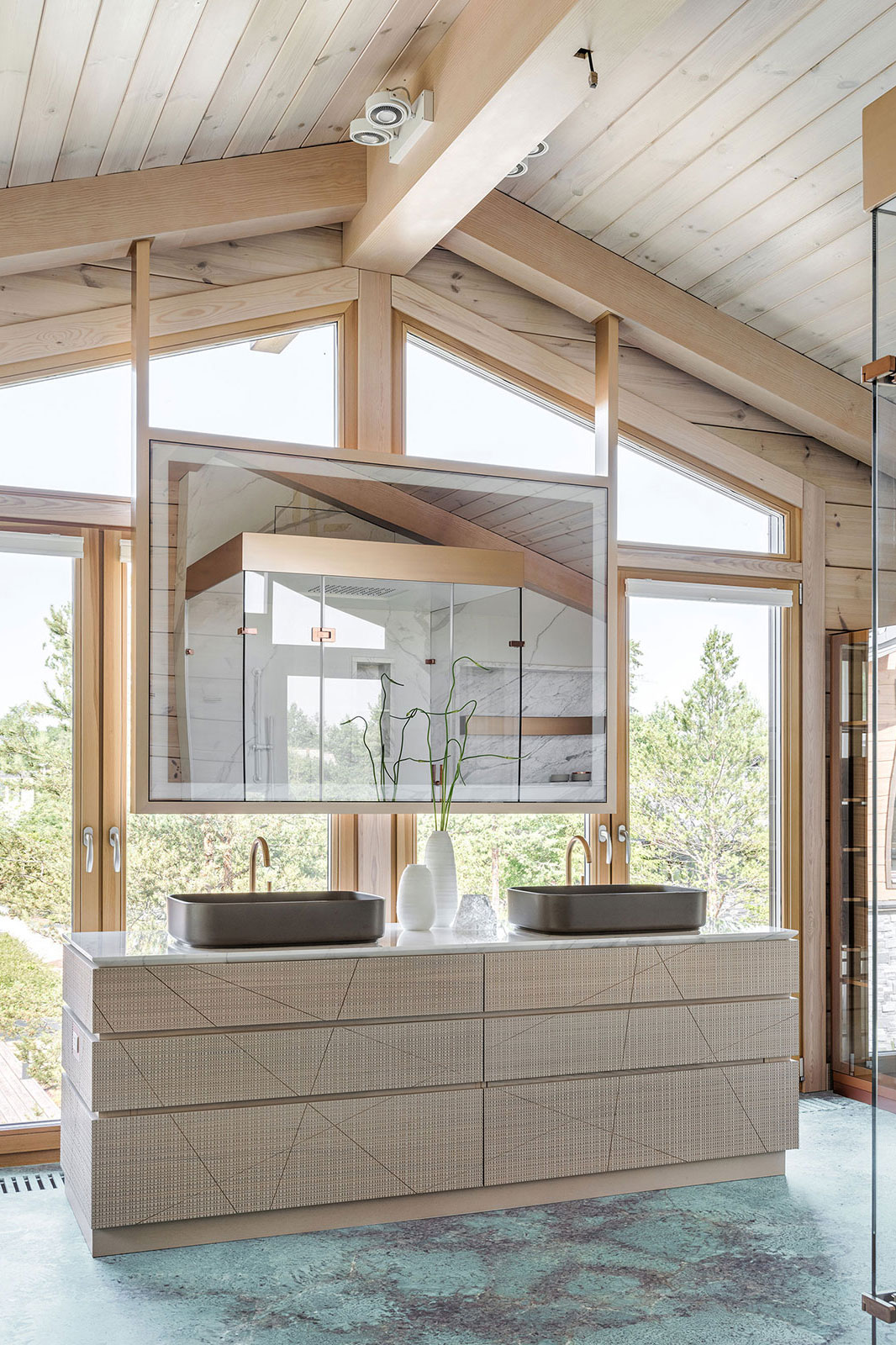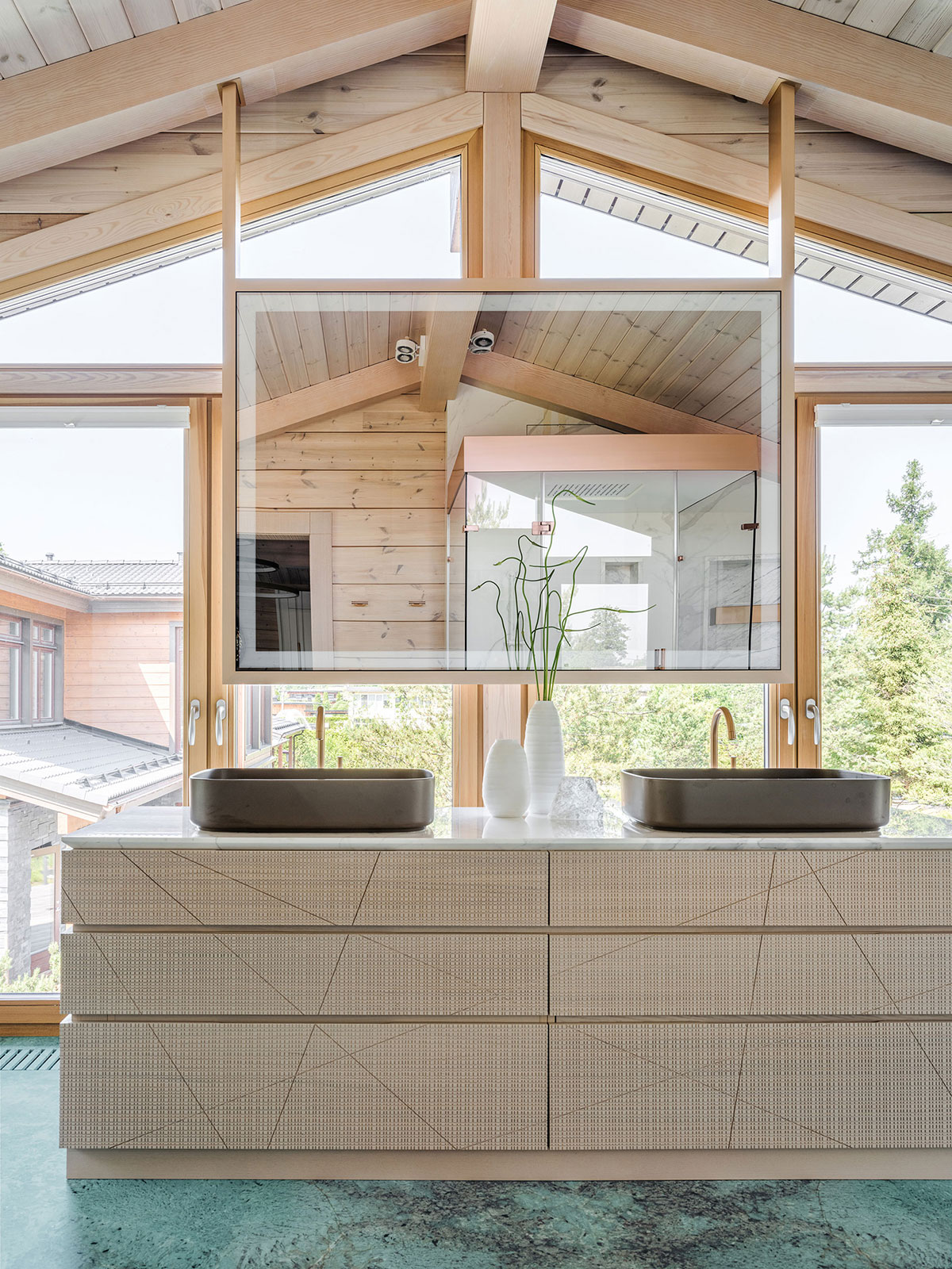 Просторную ванную комнату на втором этаже загородного дома сложно назвать помещением: это наполненное воздухом и светом пространство, кажется, не имеет границ. Благодаря панорамным окнам интерьер ванной почти сливается с пейзажем. Полы ванной облицованы полудрагоценным камнем амазонитом, и это усиливает эффект слияния с природой: бирюзово-зеленый волнистый рисунок самоцвета смотрится естественным продолжением природного ландшафта.