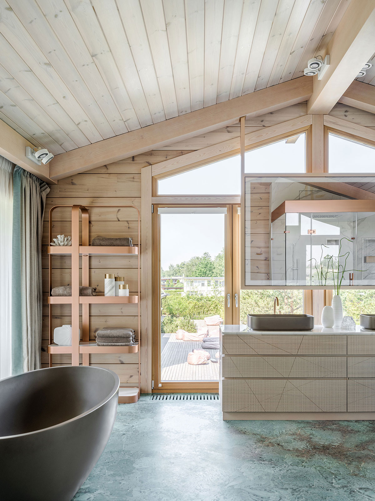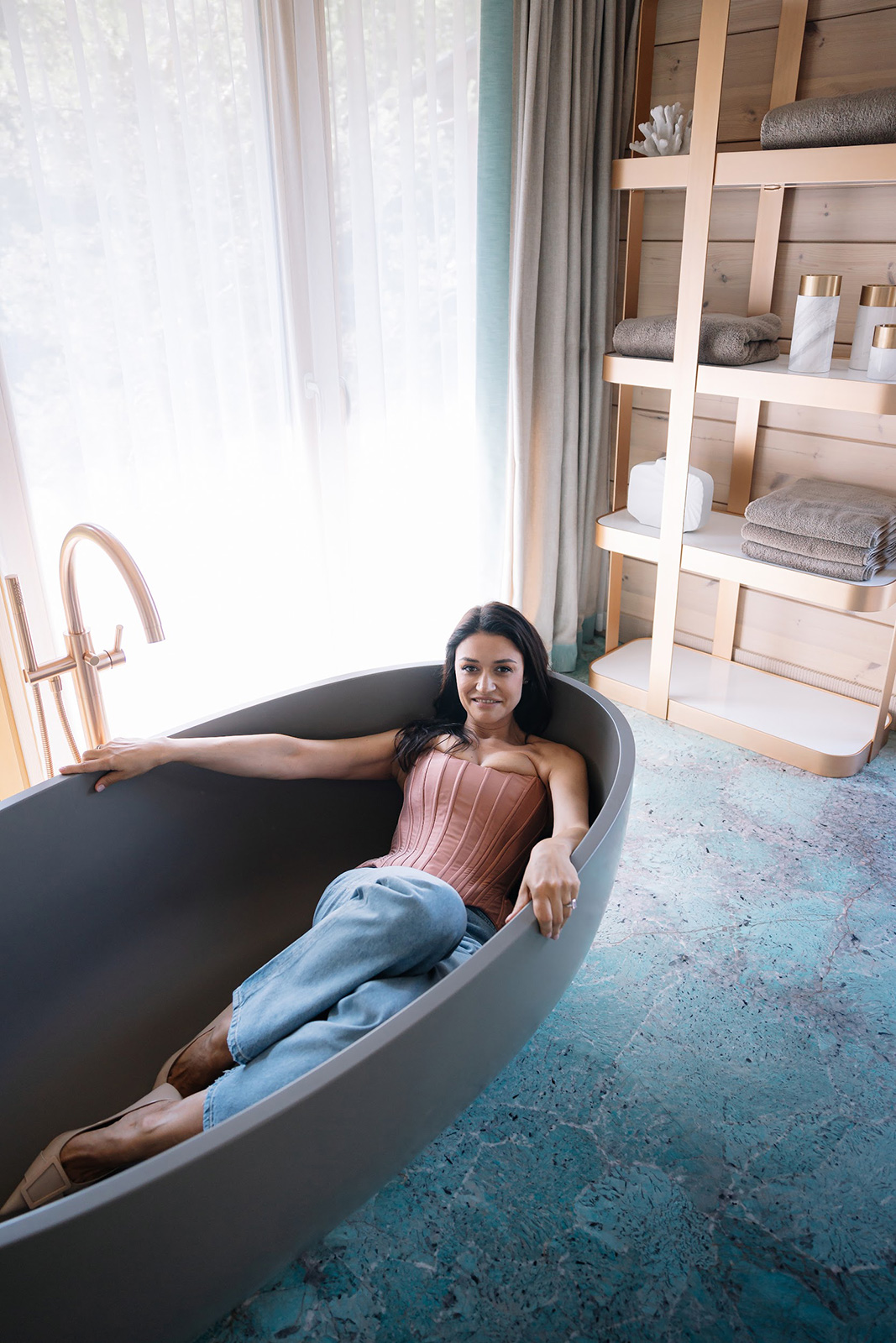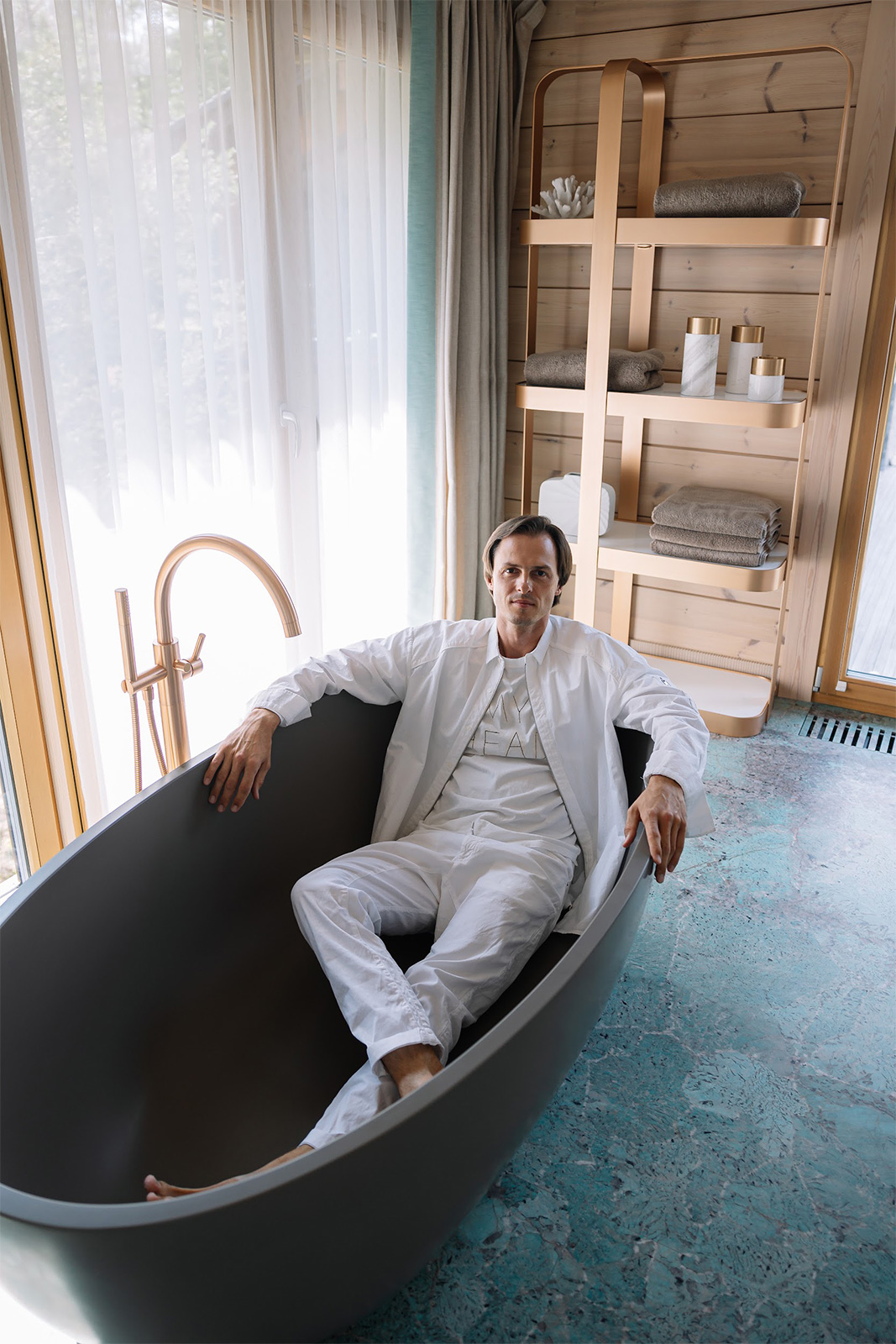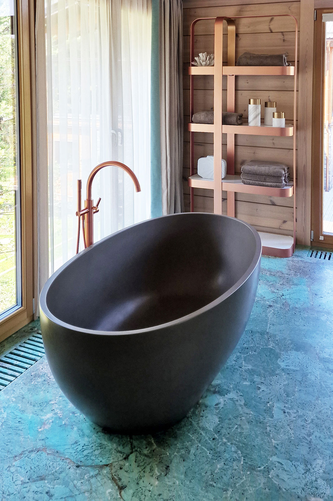 На фоне второго окна – овальная ванна итальянской марки Cielo минерального цвета taupe и напольный однорычажный смеситель с ручным душем Charleston Royal в том же изысканном финише из драгоценного матового розового золота.