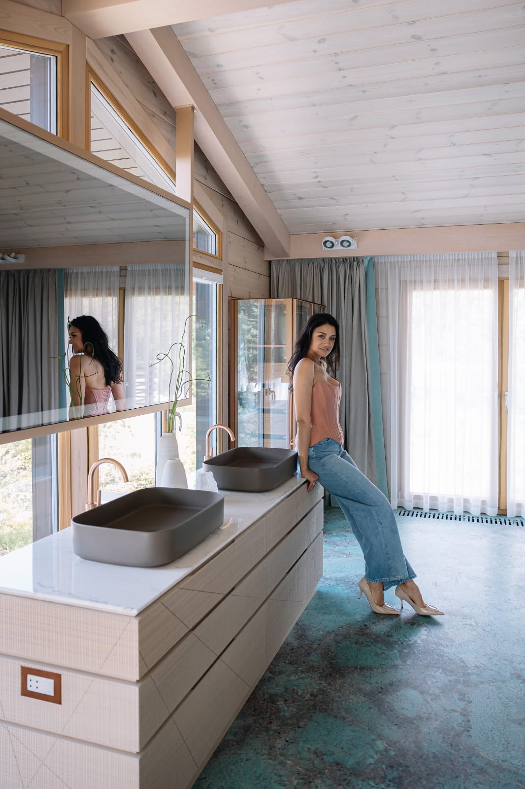 Эффектная дизайнерская находка – свободно стоящая на фоне панорамного окна тумба с раковинами и свисающее с потолка зеркало, в которое интегрирован скрытый телевизор. Элегантный и лаконичный однорычажный смеситель Charleston Royal в теплом оттенке матового розового золота эффектно оттеняет и тонко подчеркивает серый оттенок скульптурной раковины Cielo и изящный паттерн столешницы из светлого мрамора Statuario.