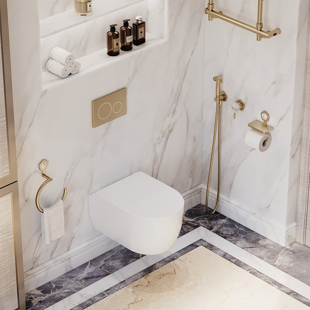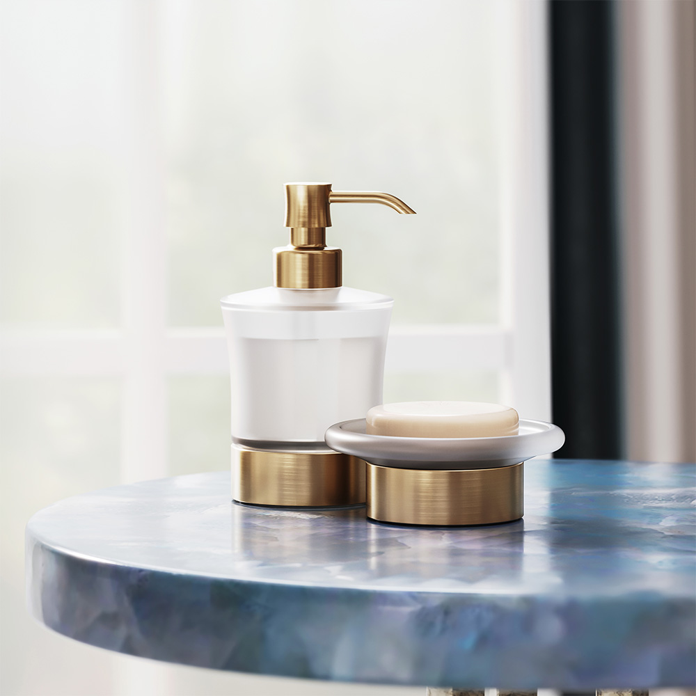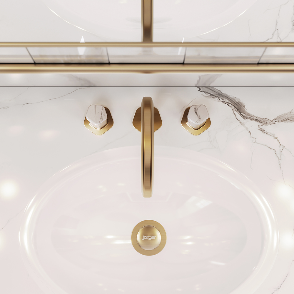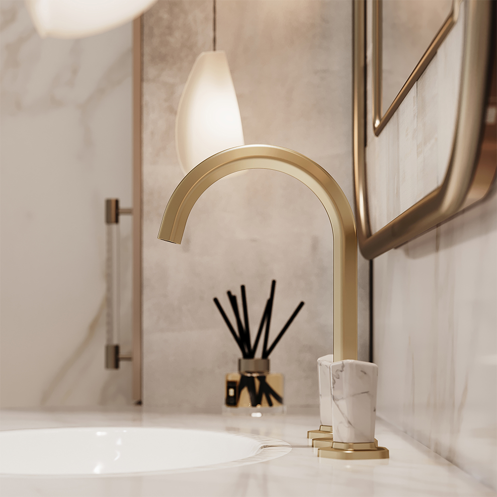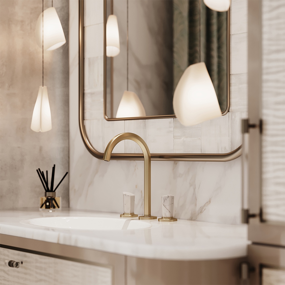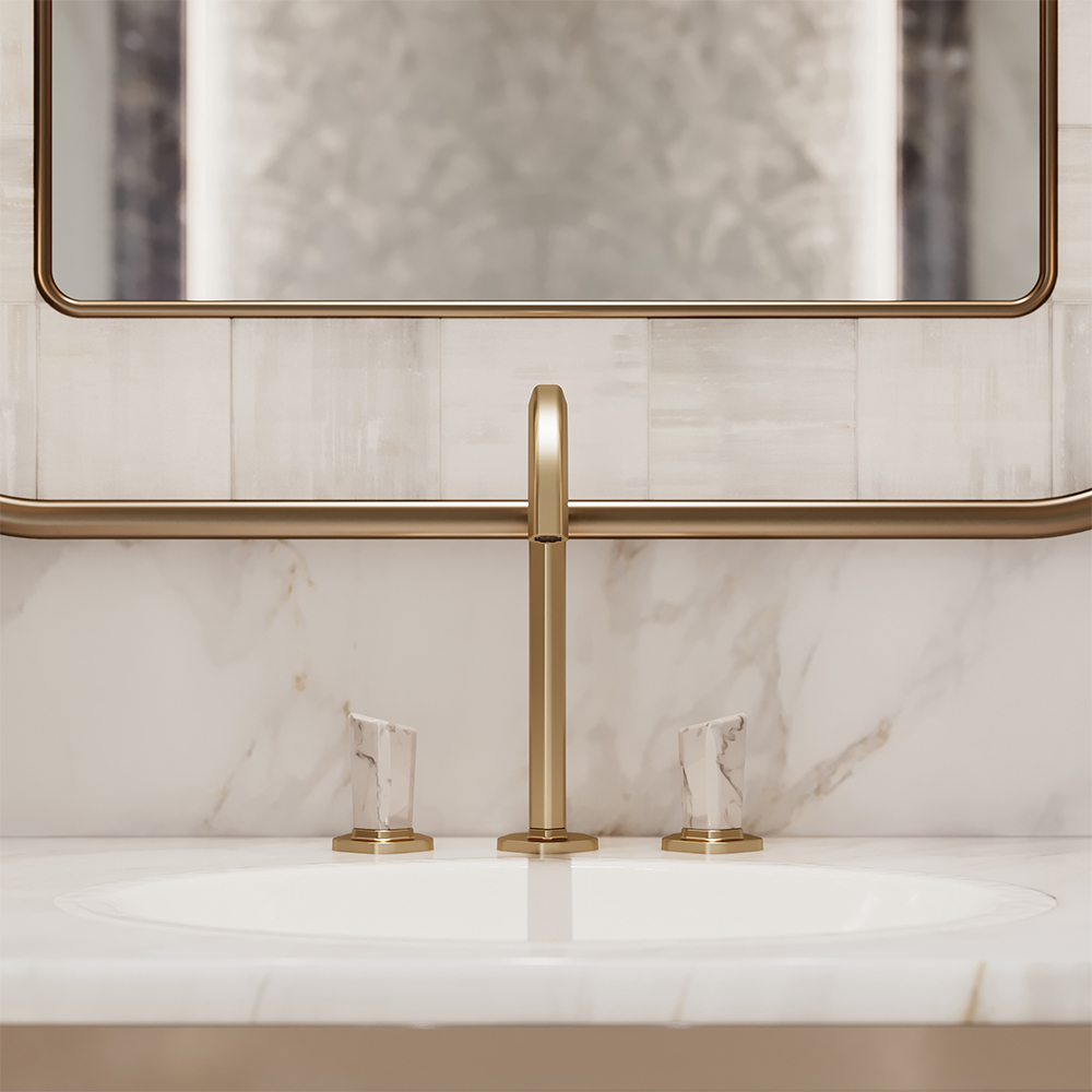 Ручки-стелы Shadó подчёркивают богатство натурального камня, привнося в интерьер выразительность, изысканность и шарм. Объемная форма пятигранника с деликатно скругленными краями позволяет в полной мере раскрыть тонкую красоту и причудливый рисунок белой бирюзы. В форме пятигранника выполнены также излив смесителя, розетки ручек и аксессуаров, корпус термостата. Благородный финиш из матовой брашированной латуни с 18-каратным золотом и тонкий профиль излива перекликаются с изящной окантовкой рамы зеркала.