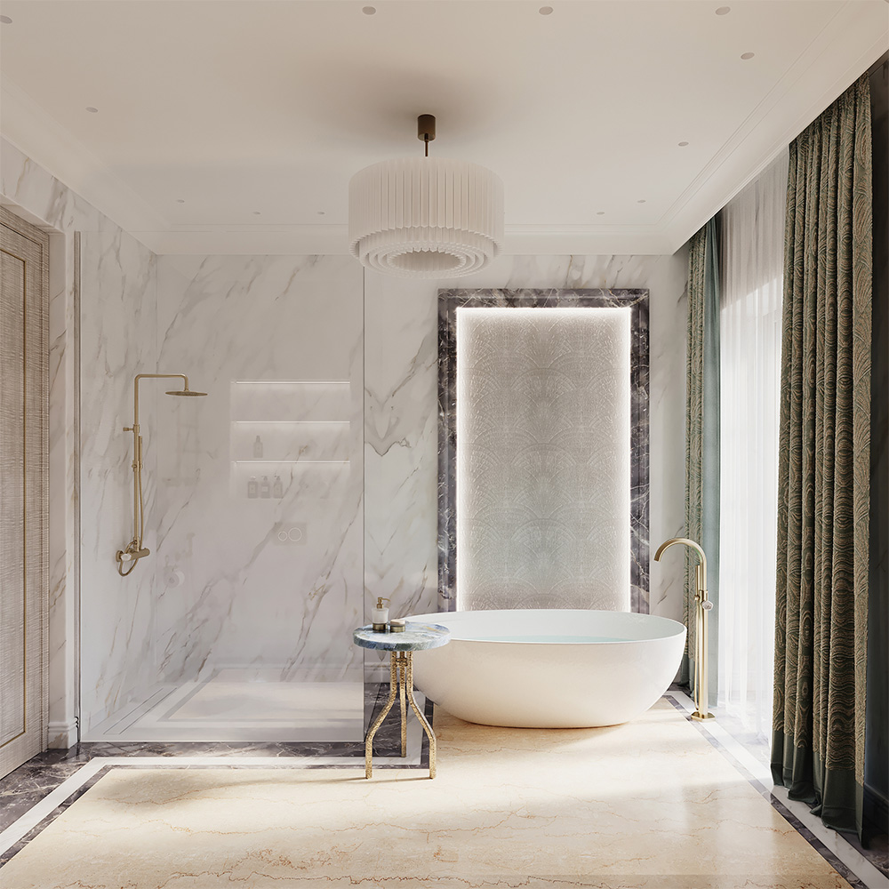В представленной ванной комнате дизайнер использовала несколько видов природного камня, созвучных по цветовой гамме и рисунку: в декоре стен - мрамор Calacatta, в отделке пола – натуральный мрамор Fior di Bosco бежевых тонов и Bardiglio для серой окантовки.