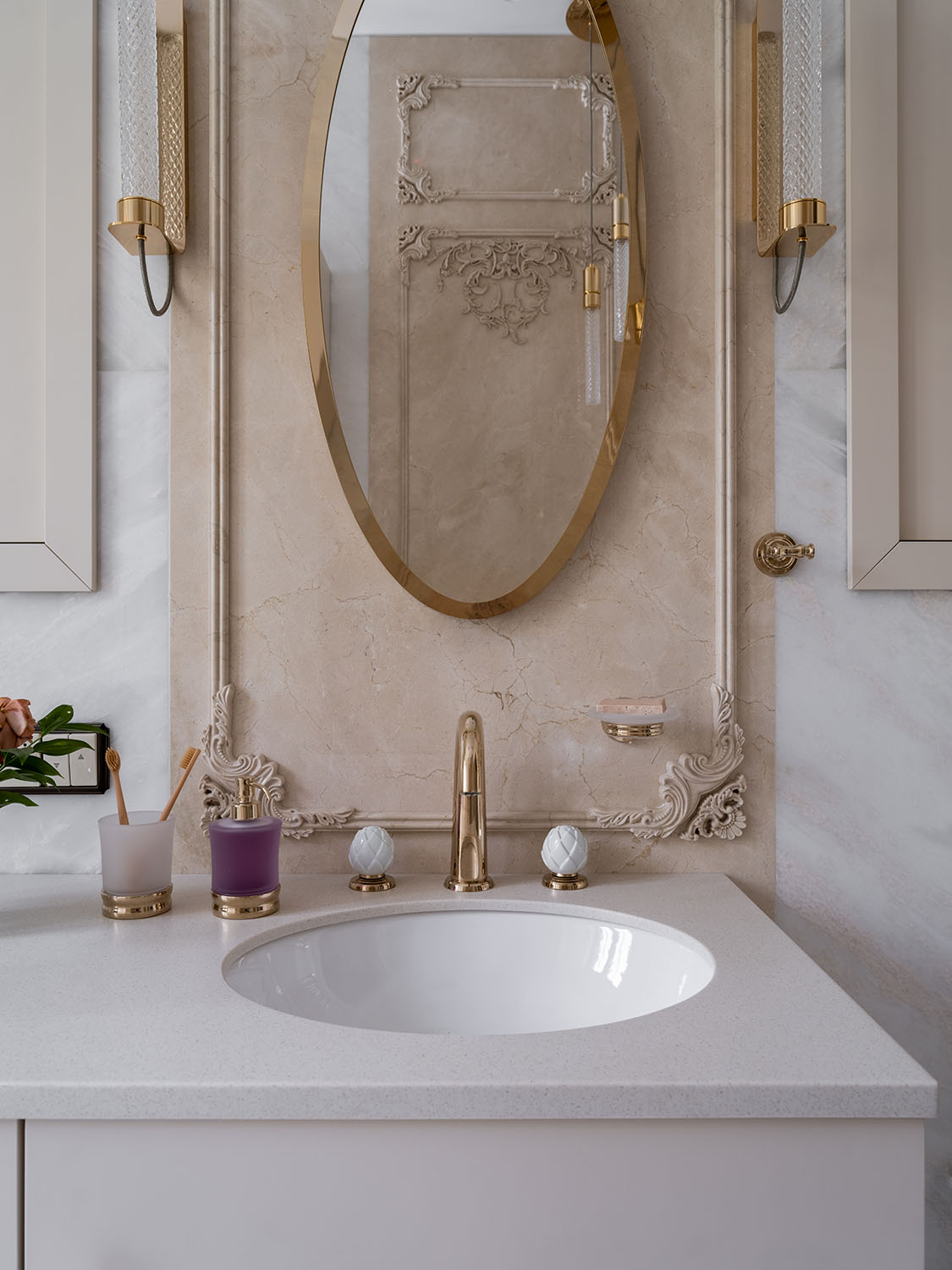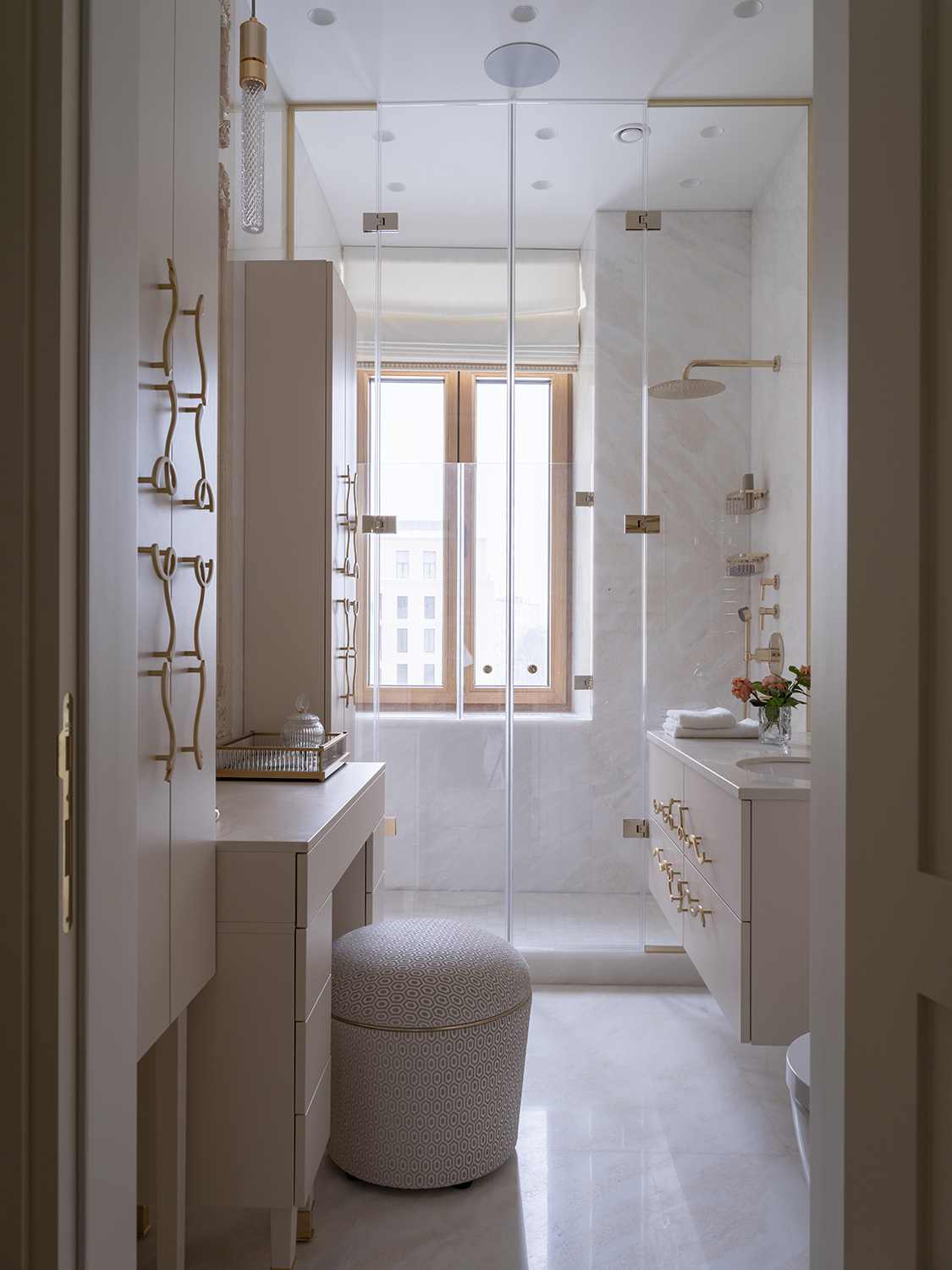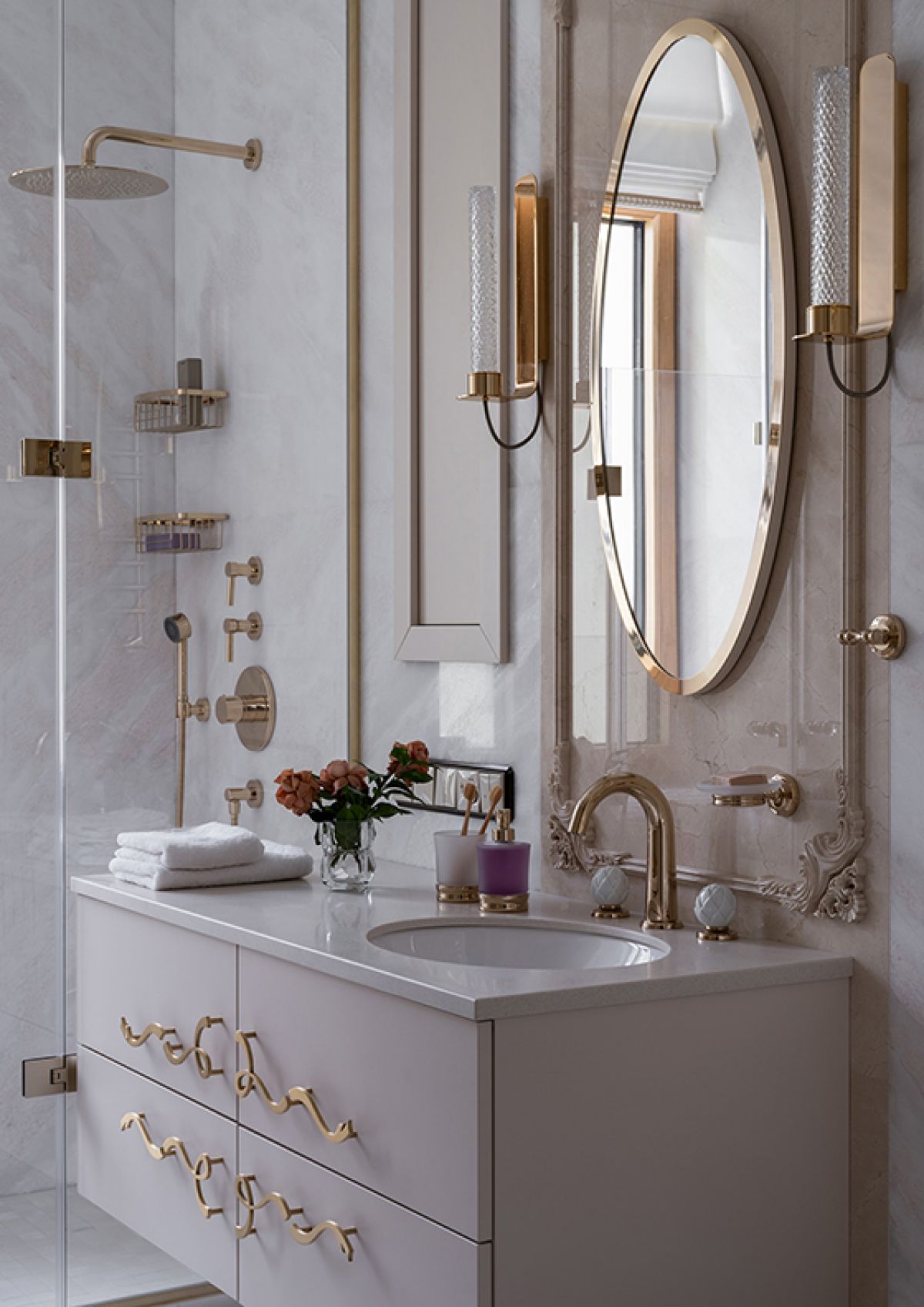 Ванная комната с окном и просторной душевой кабиной отражает авторское прочтение стиля «современная классика». Дизайнер создала богато декорированный, изысканный, воздушный и женственный интерьер: благородные текстуры натурального камня соседствуют с мягким блеском позолоченной латуни, пастельная персиково-серая палитра создает атмосферу уюта. Дополняют образ тонко подобранные дизайнерские акценты: овальное зеркало на панели-виньетке, изящные ручки мебели, искрящиеся хрустальные бра.