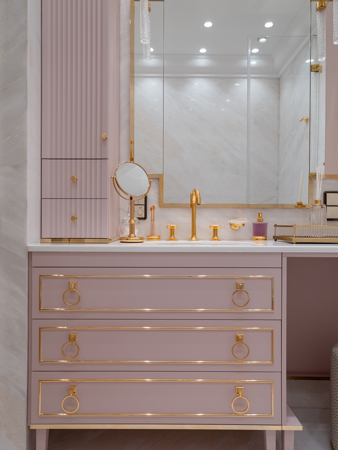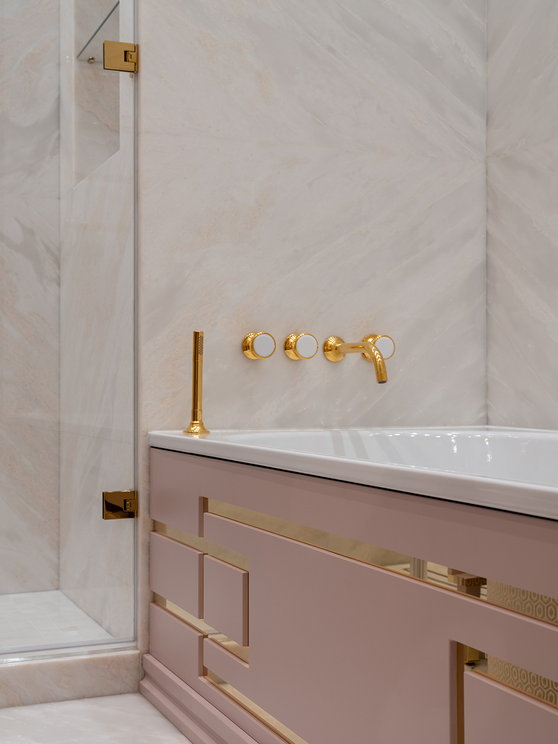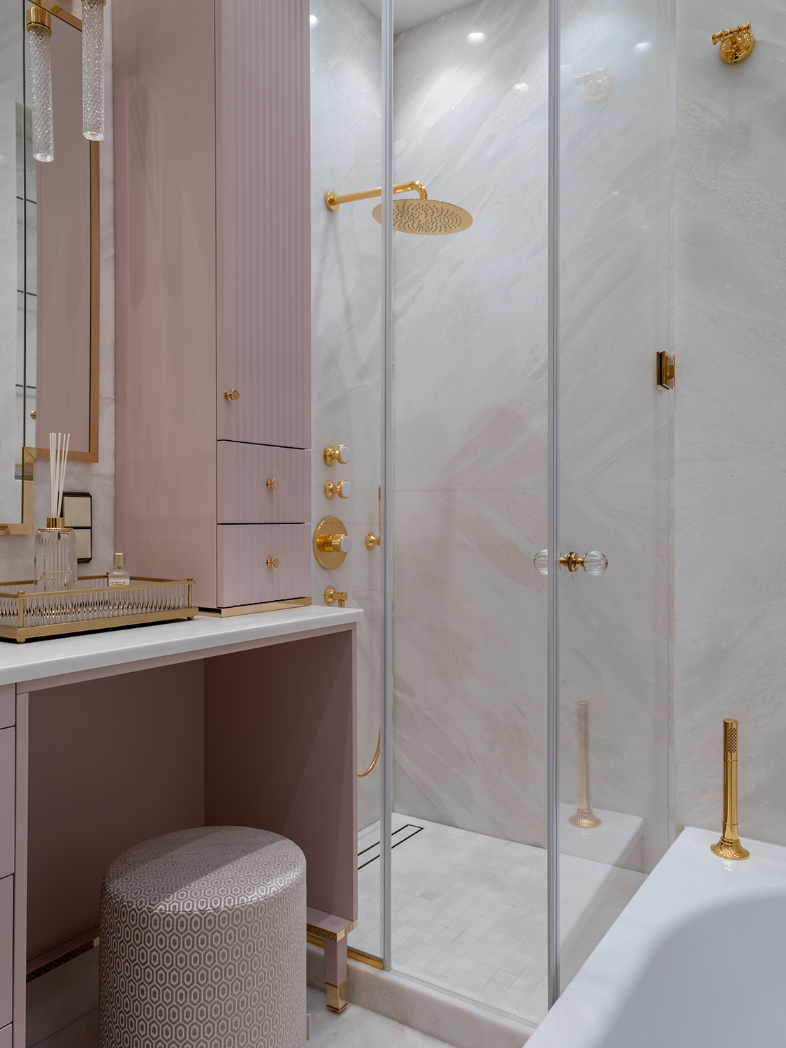 В интерьере основного санузла Мария Боровская представила смелый микс ар деко и неоклассики: сочетание розового и золотого, геометрический орнамент из латуни, крупноразмерный рисунок керамогранита и тонкая вертикальная фрезеровка фасадов мебели.