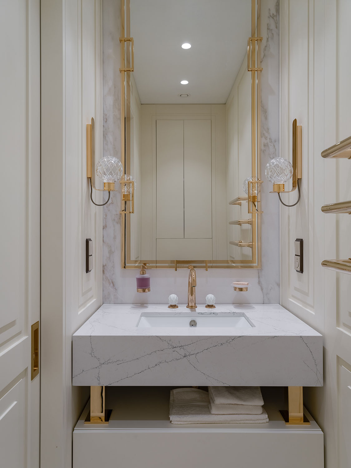 В концепцию интерьера идеально вписывались по своей форме смесители и аксессуары из новой на тот момент коллекции Jörger Valencia. Благородный профиль излива и глубокая гравировка корпуса ручки в форме ромбов полностью соответстовали духу ар деко. Но единственный имеющийся в 2019 году вариант декора ручки с черным кристаллом в интерьере смотрелся бы слишком контрастно и разрушал романтичную ауру пространства.