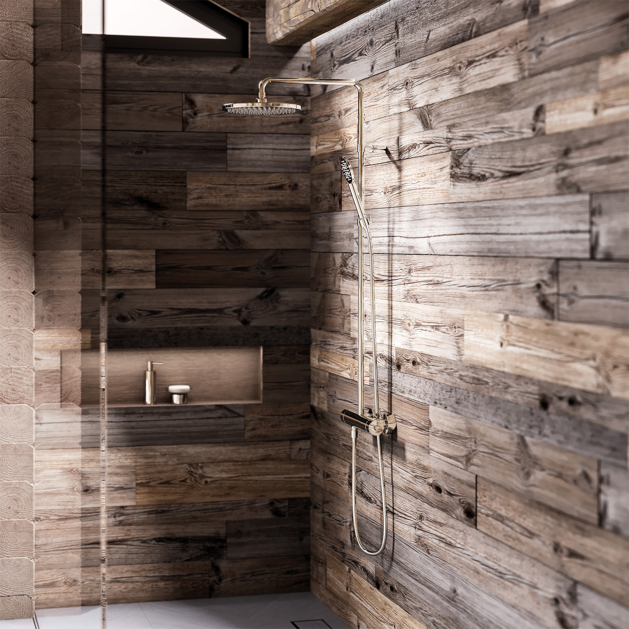 This bathroom inspiration in a newly interpreted chalet style with “Eleven” in polished nickel shows exemplary components from the extensive range. On show are