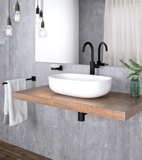 A wide range of accessories picks up on the round form language with square elements. At the highest level of perfection, precisely hand-worked surfaces complete the exclusive bathroom design.