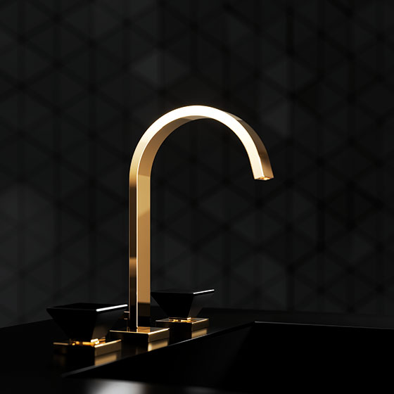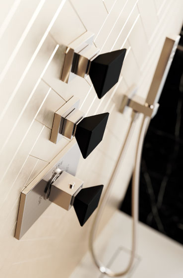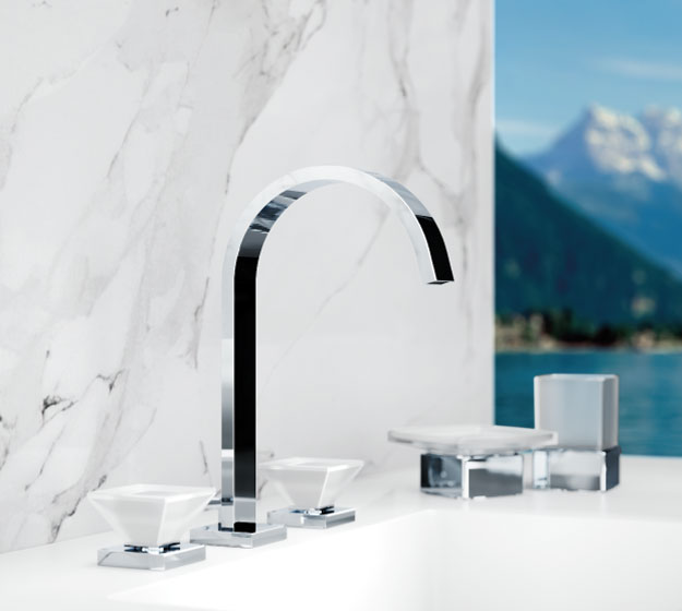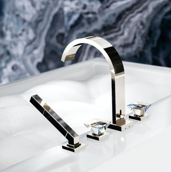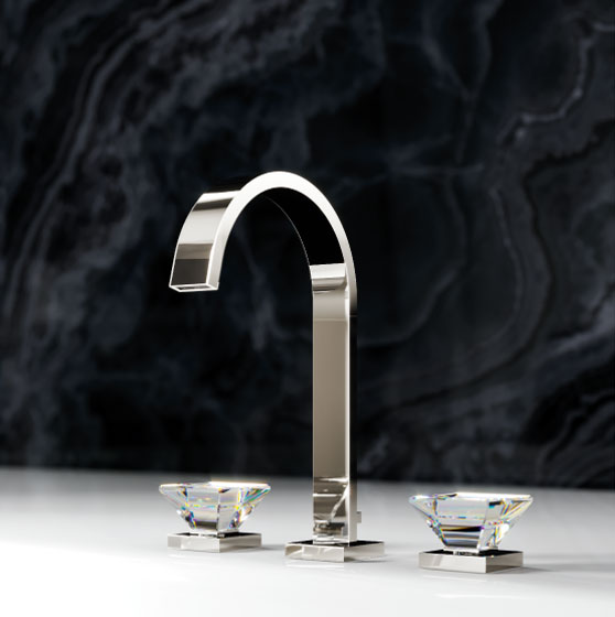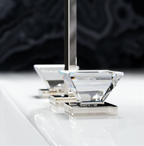 Inspired by the magic effect of a diamond, designer Oliver Jörger developed the „Empire Royal Crystal“ series of taps and accessories. In the shape of a reversed pyramid, the handles of the modern, straight-lined collection are made from high quality, polished crystals.